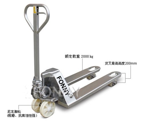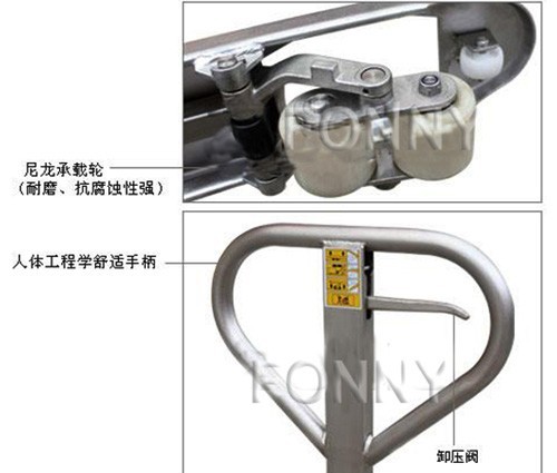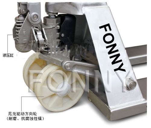 • 所有部件都由不銹鋼制成包括液壓泵、貨叉架、手柄、推桿、軸承、插銷和螺栓等等。