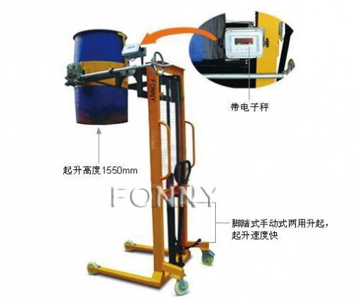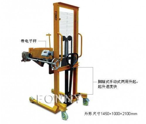 ·帶電子秤稱重式液壓油桶搬運裝卸倒料車,有置零、去皮、稱重功能,精確度可達(dá)到±100克;